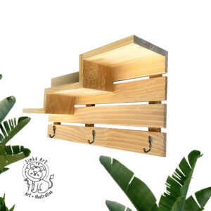 Kệ gỗ thông tự nhiên treo tường hai tầng decor, trang trí kèm móc treo quần áo phụ kiện đa năng